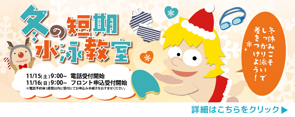 冬の短期水泳教室の日程を公開いたしました。11/19(火)12時~電話予約受付開始、11/20(水)11時~フロント申込開始!日程詳細はこちらをご覧ください。