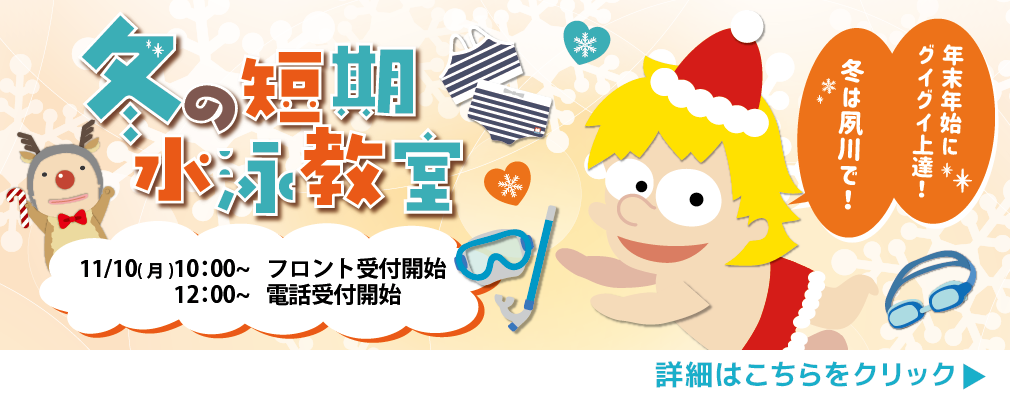 冬の短期水泳教室の日程を公開いたしました。11/18(月)10時~フロント予約受付開始、11時~電話受付開始!日程詳細はこちらをご覧ください。