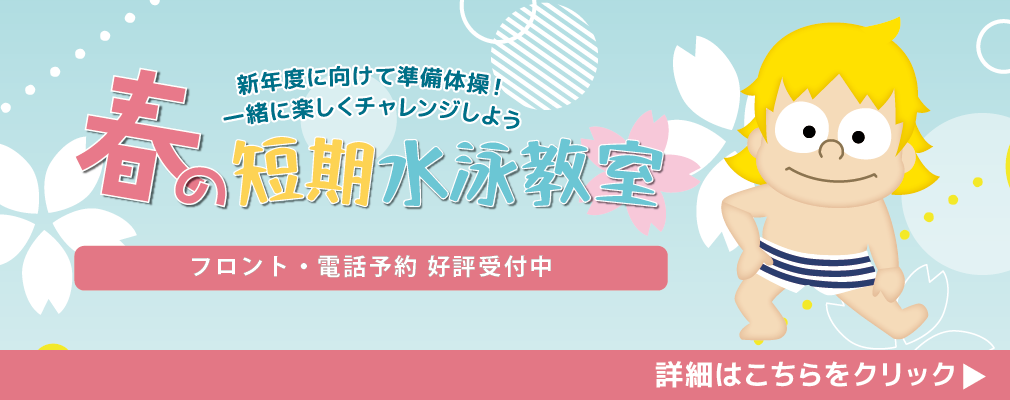 春の短期水泳教室の日程を公開いたしました。フロント・電話予約受付中!日程詳細はこちらをご覧ください。